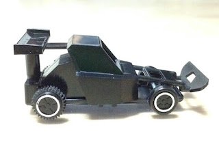 キャビンの天井と動力部がぎりぎり当たらない程度になるよう、ボディの前後ピン受けをカット。チョロQのゴムタイヤをゼロファイターのタイヤに被せてみました。すると少し箱絵との違和感が少し解消されました。